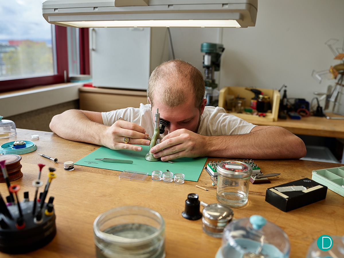 Мастерская находится в современном промышленном здании, прямо по соседству с ателье Доминика Рено. Если вы помните из истории о Petermann Bédat, Доминик принял предложение наставничества в обмен на оплату за помощь в украшении нефункционального прототипа DR01 First Twelve. Насколько нам известно, часы - пока не названные, которые мы будем называть Seconde Morte.